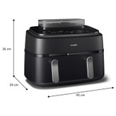 این هواپز فیلیپس با ظرفیت 9 لیتری دارای 2 سبد غیر هم اندازه بوده که سبد کشویی بزرگتر 6 لیتر و سبد کشویی کوچک تر 3 لیتر می باشد. درون سبد بزرگتر می توانید غذاهای اصلی، مرغ، ماهی، جوجه، کیک و درون سبد کوچکتر مخلفات و تنقلات، سیب زمینی و قارچ سرخ کرده، بادمجان، سبزیجات طبخ شده را درست کنید. این دستگاه تا 1100 گرم سیب زمینی سرخ کرده، 1600 گرم سبزیجات یا 12 ران مرغ را در خود جای می دهد. سبد بزرگ همچنین برای یک مرغ کامل 1.2 کیلوگرمی مناسب است.