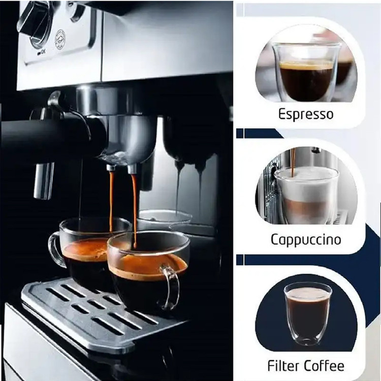 با اسپرسوساز دلونگی مدل BCO420 می توان سه نوع قهوه فرانسوی، اسپرسو و کاپوچینو تهیه کرد. برای تهیه قهوه فرانسوی از نیمه سمت راست که دارای یک مخزن آب و قهوه است، استفاده می شود. با استفاده از این دستگاه می توانید به اندازه 10 فنجان قهوه فرانسوی تولید کنید. تعداد نازل خروجی دستگاه برابر دو بوده و در تمپر می توان پودر و یا پد قهوه قرار دهید. همچنین در قسمت زیر نازل اسپرسو سینی چکه گیر برای جلوگیری از کثیفی قرار داده شده است و دارای گرم کننده قهوه نیز می باشد. قدرت دستگاه 1750 وات بوده و دارای فشاری برابر با 15 بار می باشد که در تهیه کف شیری غلیظ کمک دهنده خواهد بود. همچنین قبل از سرو قهوه و به منظور گرم نگه داشتن فنجان می توانید از سینی بالای اسپرسوساز BCO420 که در قسمت بالای آن می باشد استفاده کنید.