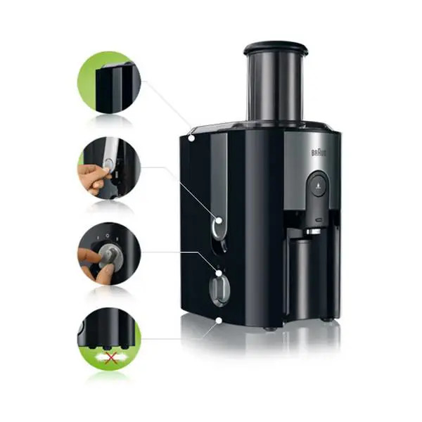 همچنین دارای یک مخزن برای جمع آوری تفاله های میوه است. آبمیوه گیری براون مدل J500 در دو سرعت کار کرده و یک وسیله تک کاره است و تمامی لوازم های آن از جمله فیلترها، مخزن و … قابل شست و شو می باشد.