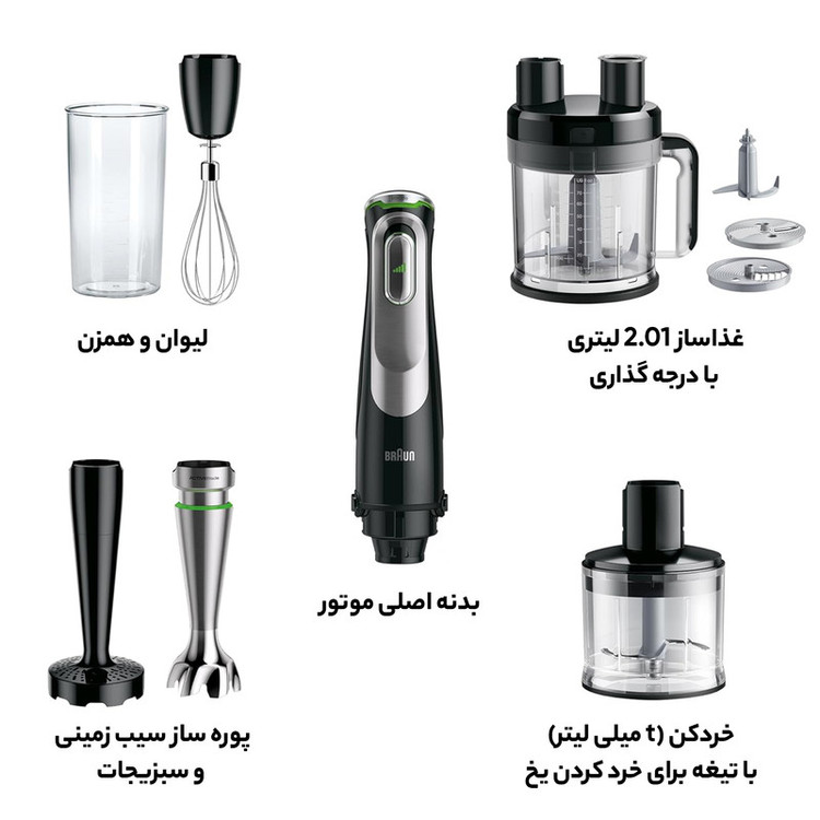 گوشت کوب برقی سری 9 براون که سفارش کشور امارت با بهترین کیفیت ساخته شده است و جزو لاکچری ترین و متفاوت ترین محصولات شرکت براون میباشد.موتور این دستگاه دارای قدرت 1100 وات در حال حاضر قویترین گوشت کوب برقی براون میباشد.این دستگاه دارای یک غذاساز ظرف 2 لیتری با سیستم درب فشاری میباشد که اصلی ترین تفاوت آن با نسخه های قبلی عدم رد کردن قطعات بزرگ از زیر رنده میباشد و همه مواد را تا اخرین ذره رنده میکند.این دستگاه همچنین دارای سیستم اکتیو بلید یا تیغه فعال کوبشی میباشد که این قابلیت را به مصرف کننده میدهد که مواد گیر کرده زیر تیغه بلندر را با فشردن و ضربه زدن له نمایید.ظرف خرد کن 350 میلی لیتری براون توانایی بسیار خوبی در خرد کردن مواد کم و گوشت چرخ کرده را داراست.همچنین در این مدل قطعه پوره ساز سیب زمینی و 5 تیغه رنده به همراه رنده سیب زمینی سرخ کرده قرار داده شده است.