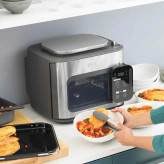 فر و مولتی کوکر رومیزی نینجا مدل SFP700 مجهز به فناوری combi cooker بوده که با داشتن المنت در بالا و پایین گردش حرارت داغ به شما امکان طبخ دو مدل غذای مختلف بصورت همزمان را می دهد و در طبقه پایین غذای کبابی آبدار و طبقه بالا غذای ترد و چیبسی را درست می کند. از پخت برنج گرفته تا پاستا، پیتزا، کیک، کاپ کیک، شیرینی، انواع کوکوها، مرغ شکم پر، ماهی و میگو سوخاری، جوجه، استیک گوشت، کباب کردن سبزیجات و گوشت، تنها موارد محدودی از عملکردهای کمبی نینجا sfp700 می باشد.