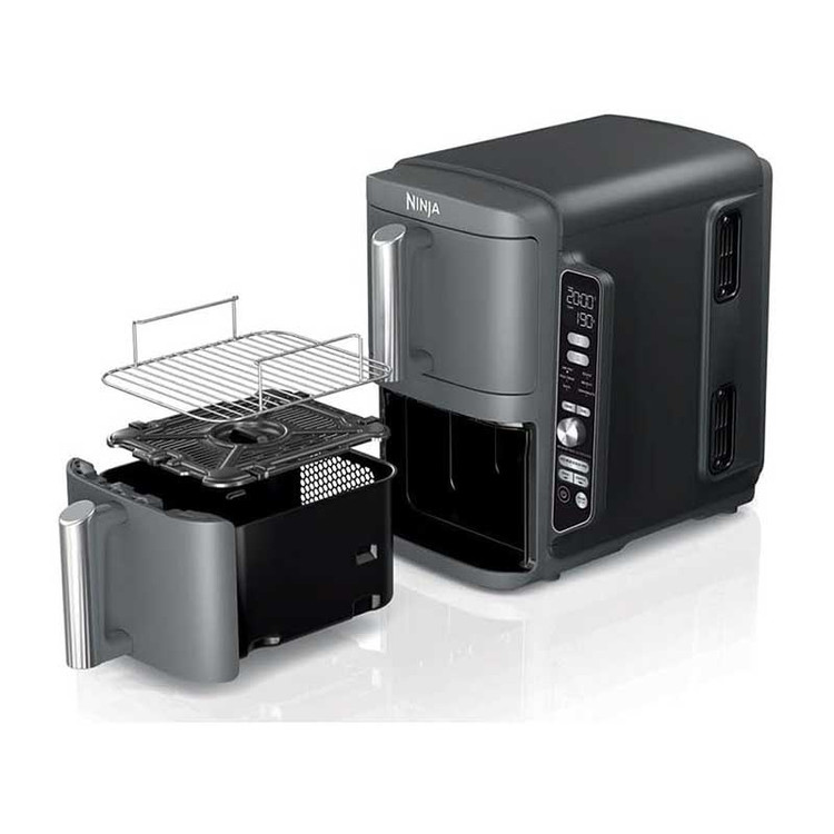 سرخ کن بدون روغن دوقلو نینجا مدل SL400 با طراحی منحصر به فرد و خاص به رنگ خاکستری توانسته نظرهای زیادی را به خود جلب کند. اکثر سرخ کن های دوقلو که به شما امکان می دهند چندین غذا را همزمان بپزید، فضای کاری زیادی را اشغال می کنند، زیرا محفظه های گرمایش کنار هم قرار می گیرند. محفظه ها توسط دستگیره های عایق نقره ای رنگ به صورت کشویی باز می شوند.